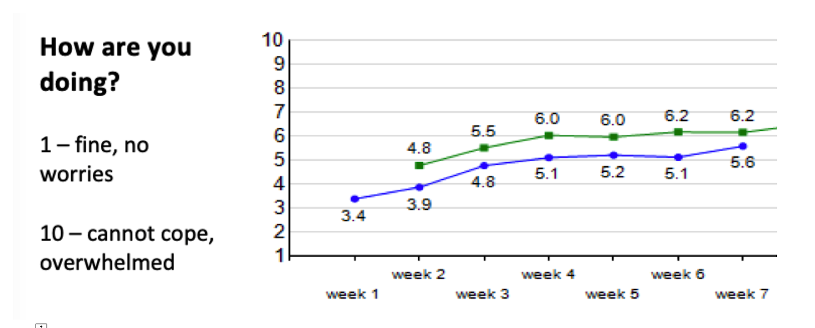 These and other similar ideas have very much informed our thinking as have looked, over the years, at the data from our own students. For over a year we have been asking our students, each week, to answer a one-question ‘how are you doing?’ survey, from 1 (fine no worries at all) to 10 (really struggling and cannot cope).