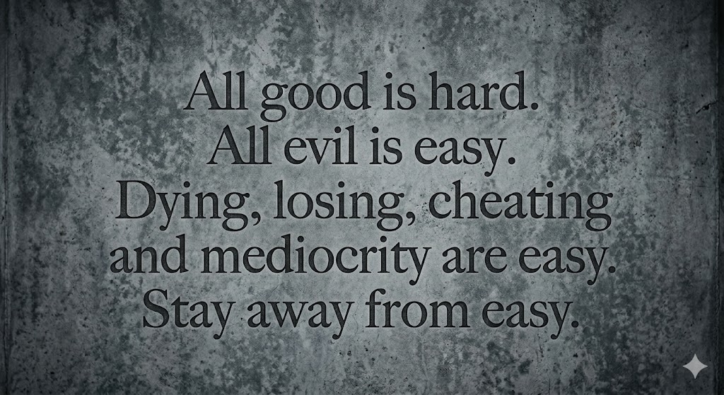 All good is hard. All evil is easy….. losing, cheating and mediocrity is easy. Stay away from easy.
